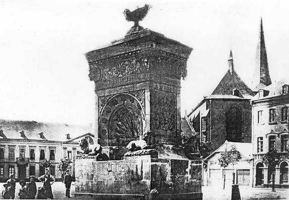 "Zu den Bauten, die im historischen Trier nur ein kurzes Dasein fristeten, ehe sie der Spitzhacke oder einer Versteigerung zum Opfer fielen, gehört zweifellos der Viehmarkt Brunnen. Am 23. April 1825 "zum allgemeinen Besten" nach Entwürfen des Stadtbaumeisters Johann Georg Wolff ungefähr in der Mitte des heutigen Platzes errichtet, erfreut sich der acht Meter hohe Brunnen keines langen Lebens. Ganz offensichtlich ist das mächtige, mit Sinnbildern aus der Vieh- und Landwirtschaft verzierte Bauwerk aus hellem Sandstein bereits nach 70 Jahren unansehnlich geworden. Im Stadtratsprotokoll vom 15. Juni 1898 läßt sich zudem nachlesen, dass er nur noch "bedingt verwendungsfähig" ist.